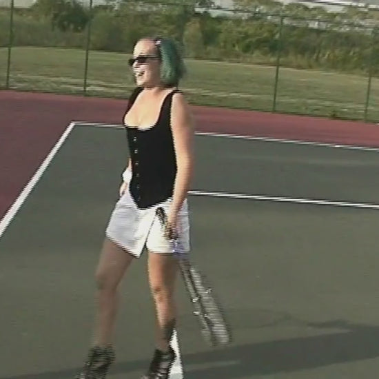 Randi Johnson and Danielle Raftus team up to play a few rounds of tennis. But the corsets and high heels will not make it easy for them. Danielle is wearing a corset, white mini skirt, suntan pantyhose, and black patent platform sandals. Randi is wearing a corset, white mini skirt, suntan pantyhose, and black patent high heel pumps. This video is from Doubleshot – Gallery #1