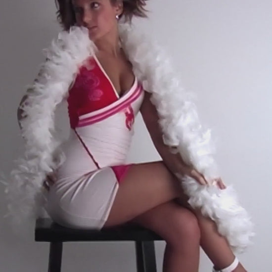 Kim Scarduzio switches things with a playful and innocent cheerleader costume. The pink and white spandex mini dress hugs her petite frame, while white patent high heel pumps add an extra kick to her cheers. And don't worry about her shoes falling off with her high kicks. We've got them strapped around her ankles pretty tight. Video is from Kim Scarduzio – Gallery #2