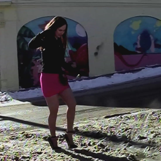 After a brief snowstorm Rand heads out to her car to go shopping. The snow has turned to slush and there is a light glazing of ice on the ground. She gets close to her car and then suddenly her feet slip out from under her. Randi is wearing a black blouse, pink mini skirt, suntan pantyhose, and black patent high heel super arch pumps. This video is from Randi Johnson – Gallery #68